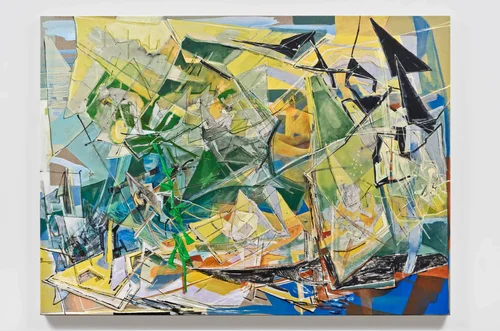 Acrylic, collage, and oil stick on linen